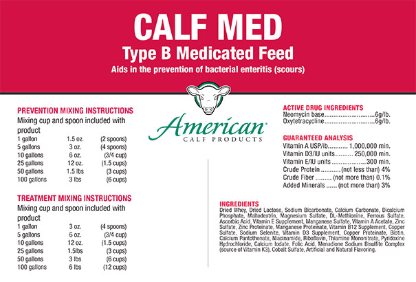 - CALF MED contains Neomycin for prevention and treatment of bacterial enteritis (Scours).